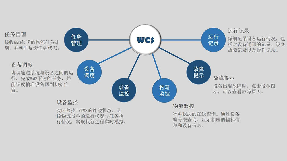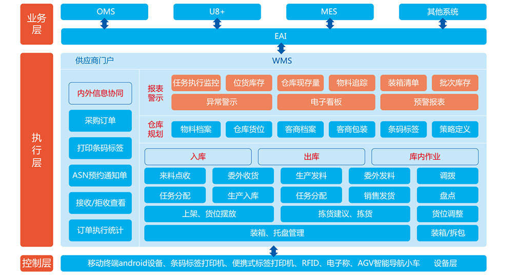 对接客栈管理系统(WMS),,,,,,,,集成种种装备数据,,,,,,,,监控和统一调理堆垛机、机械人、AGV系统等底层物流装备,,,,,,,,高效执行妄想好的营业流程。。。。。